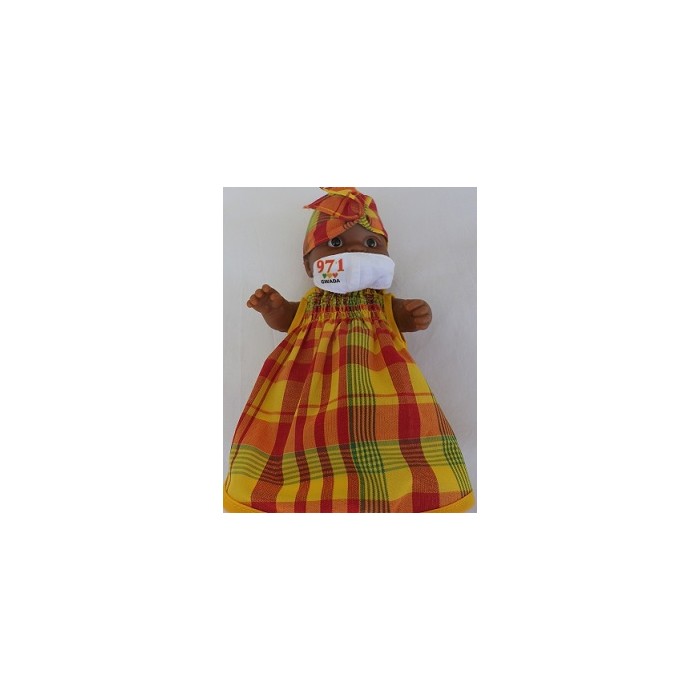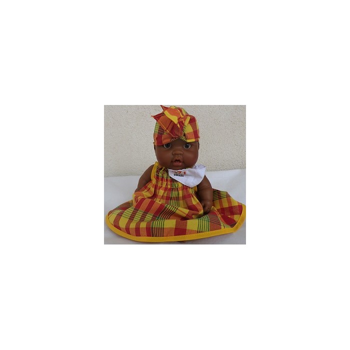 Poupon bébé créole habillée avec son costume madras traditionnel des Antilles .