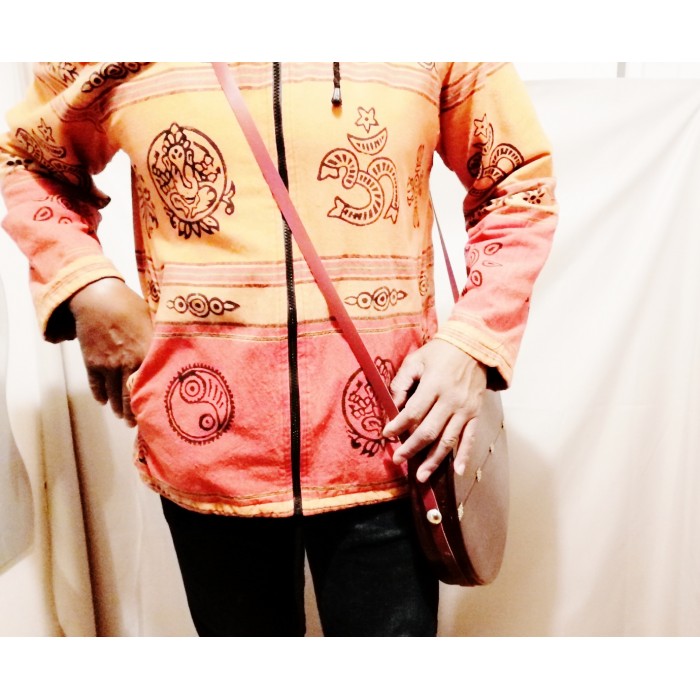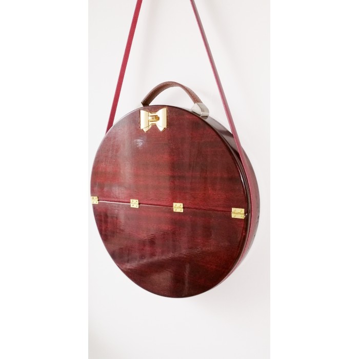 Ce sac se présente avec une fermeture en forme de nœud, avec une poignée courte et une anse en cuir tombante jusqu'à la hanche.