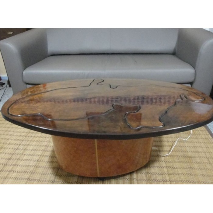 Cette table basse en mahogany des Antilles est de forme ovale .La carte de la Martinique est incrustée à l'intérieur .