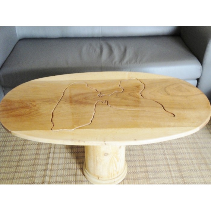 Cette table basse de la Guadeloupe avec un plateau ovale et une carte Guadeloupe découpé dans la masse